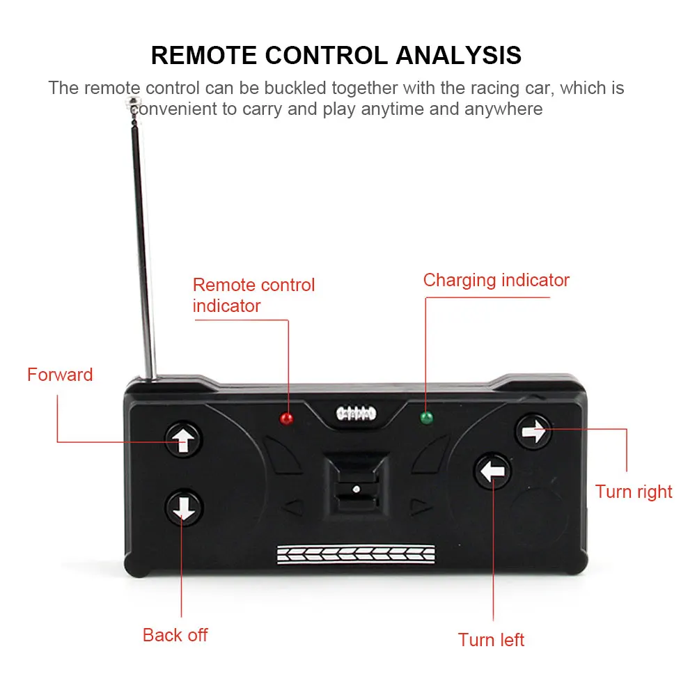3. Easy to use: The remote control can be buckled together with the racing car, which is convenient to carry and play anytime and anywhere