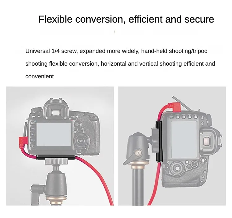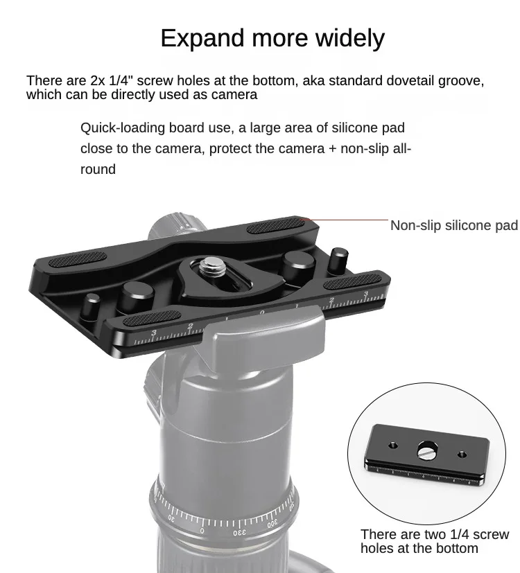 1. There are two 1/4 screw holes at the bottom, Aka standard dovetail groove, which can be used directly as a camera quick-release plate, a large area of silicone pads fit tightly to the camera, to protect the camera + non-slip