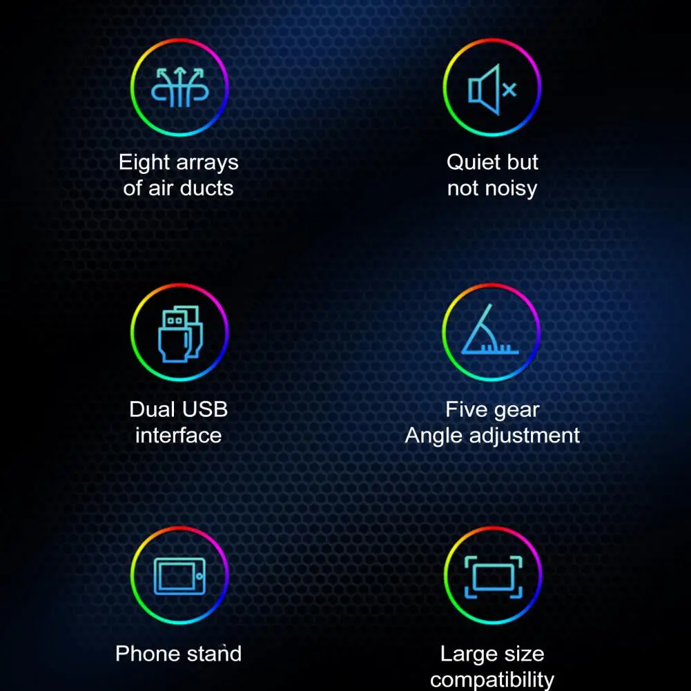 Featuring an eight-core design with 8 fans, this notebook cooling pad offers powerful heat dissipation capabilities. The adjustable fan speed, operating at 2600±10 percent RPM, effectively maintains your laptop's performance and extends its lifespan. Additionally, the ultra-quiet fans create a noise-free environment for uninterrupted work or entertainment.