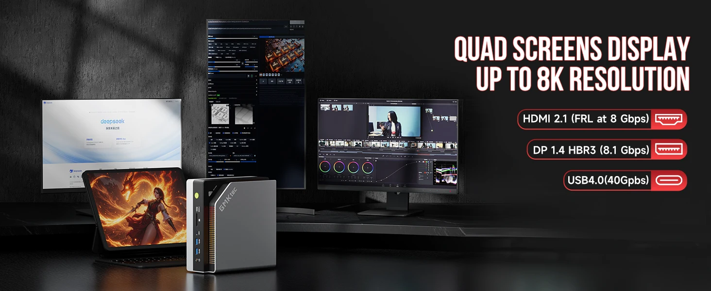 Video output: Quad Display Output, HDMI 2.1 (FRL at 8 Gbps), DP1.4 HBR3 (8.1 Gbps), USB4 (40GB/S)*2