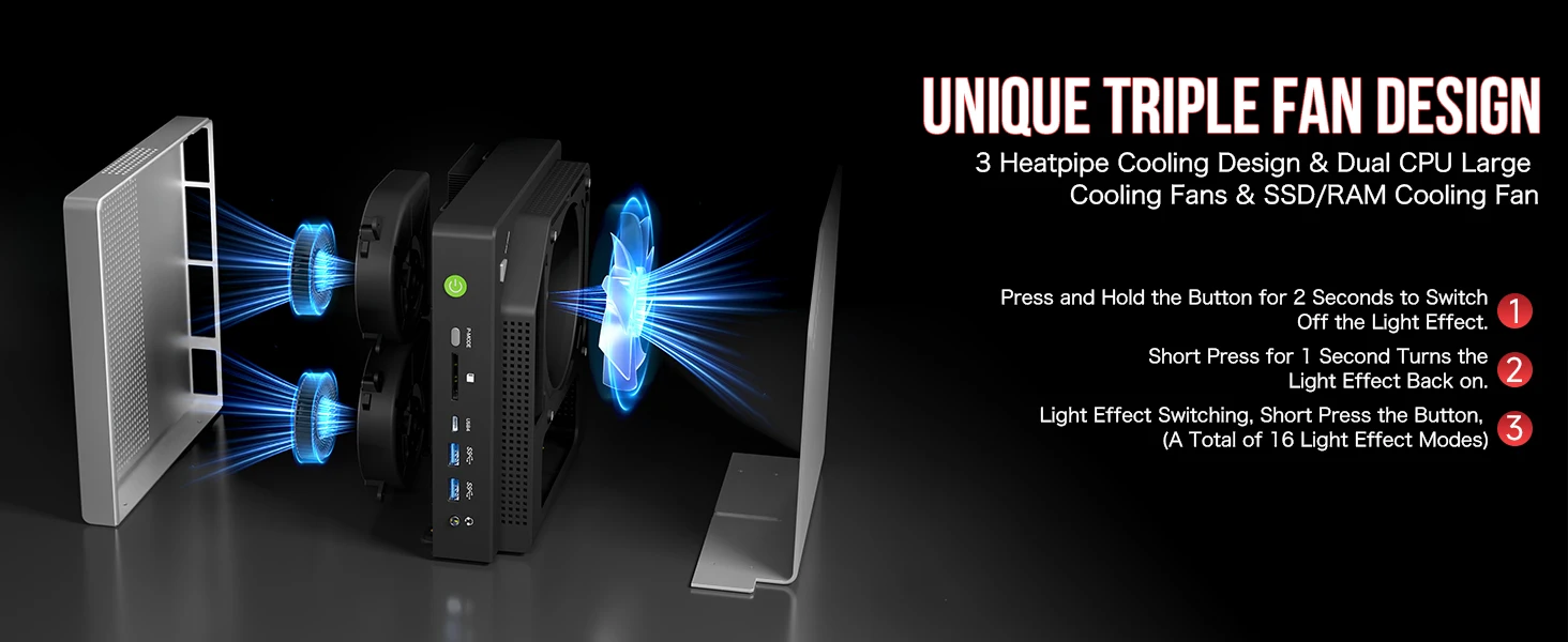 Cooling Method: Triple Heat Pipe Cooling Design: Dual CPU Large Fans + DDR/SSD Cooling Fan with Lighting