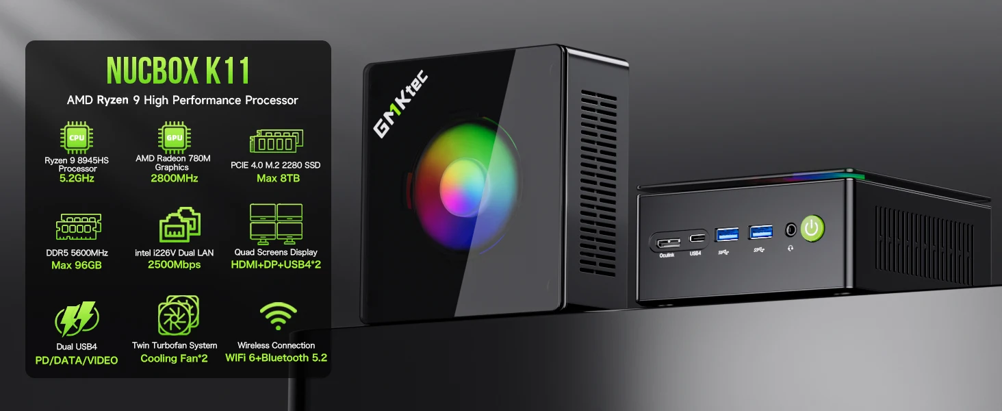 GMKtec K11 Mini PC AMD R9 8945HS DDR5 WiFi6 BT5.2 PCIe4.0 Win11 Pro M.2 2280 SSD