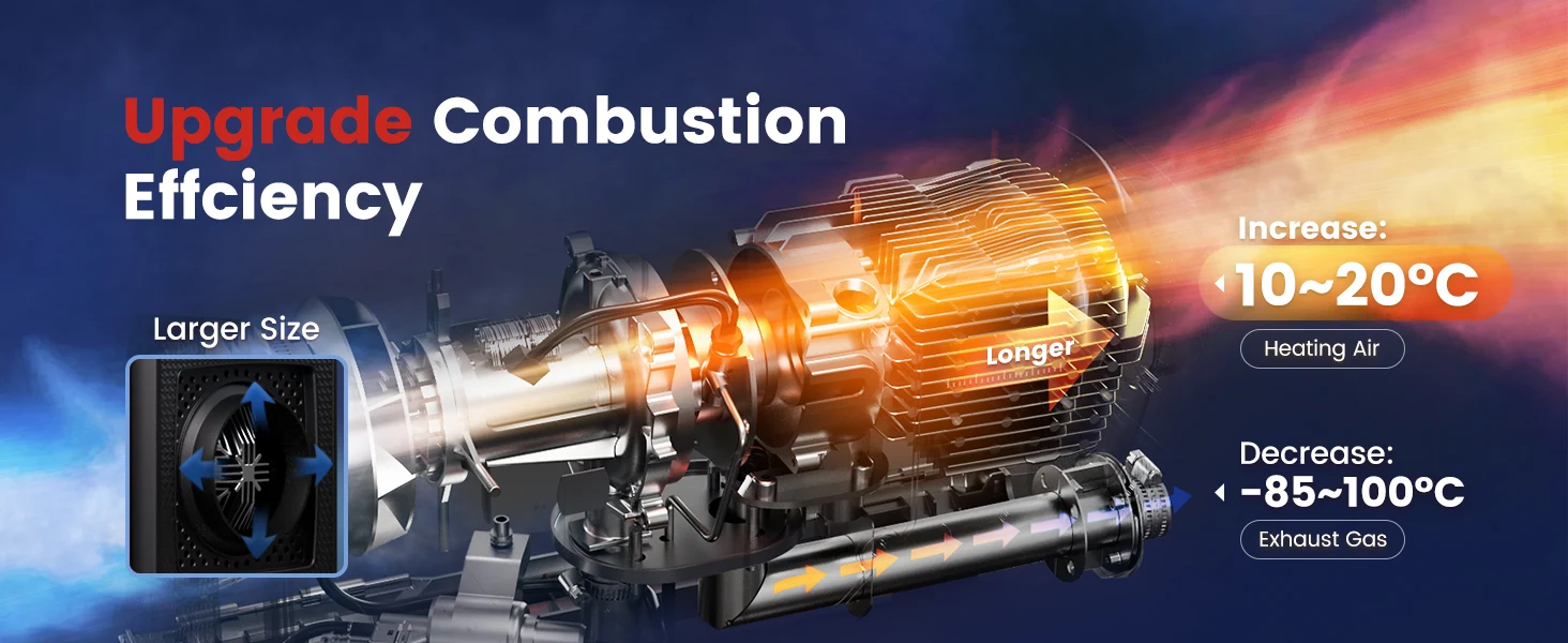 Fast Heating Technology: The aluminum body is heavier and longer, and the warm air port is wider, which improves the air temperature 10~20°C and reduce exhaust gas temperature by 50~100°C, keeping you comfortable in even the coldest conditions.