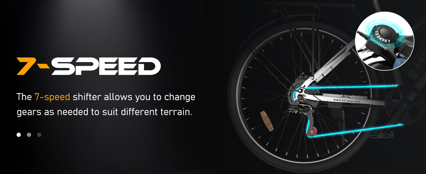 Battery of the vehicle. The bike is also equipped with seven speeds, from