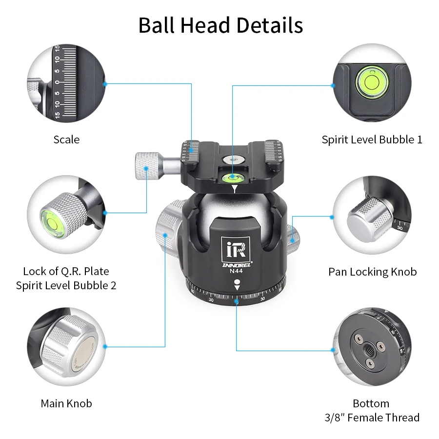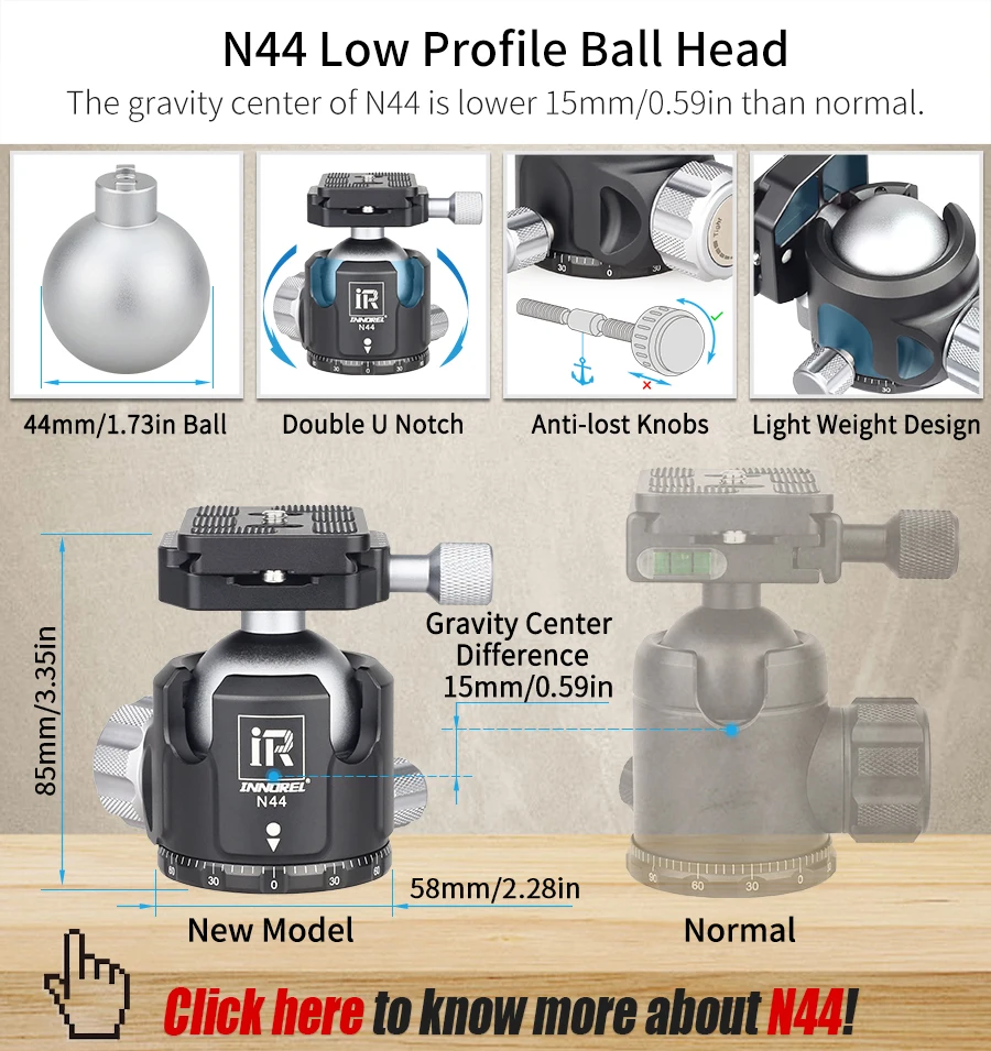 【New Design Ballhead】 The ballhead is designed with low gravity center and double U notch, the structure is more compact and reliable. CNC machining and N44 44mm(N36 36mm)large ball diameter make it extremely stable.