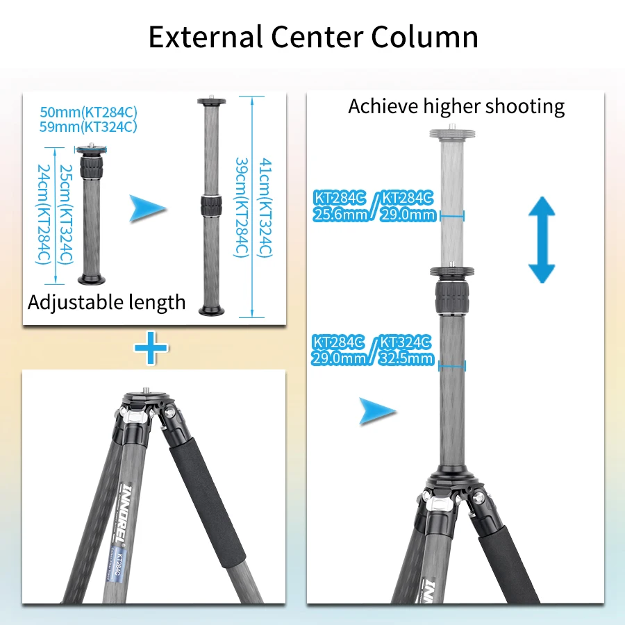 【2-SECTION ADJUSTABLE CENTER COLUMN】There is an external 2-section adjustable central column coming with the tripod,after installing it, you can get an extra height of 39cm/41cm, which can achieve higher shooting and match most photographer's need of shooting height.