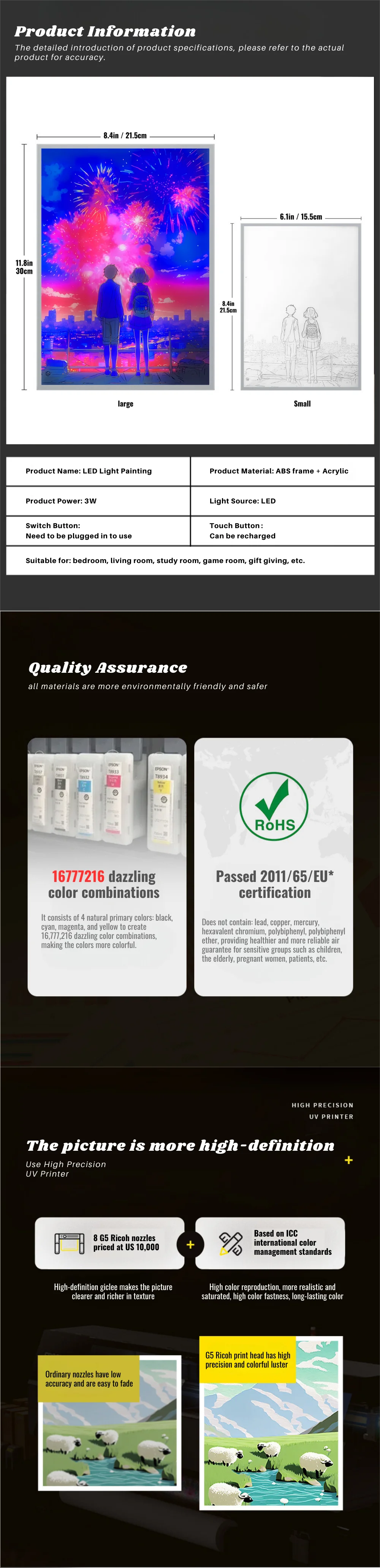 --Not only that, LED painting Lamp is also a unique gift for relatives, lovers, partners or customers to feel your love and sincerity. Whether as a birthday gift, Valentine's Day gift, wedding gift, holiday gift or business gift, LED lighting painting can become a meaningful gift.It is a personalized creative gift