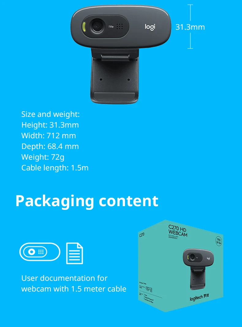 • High Definition 720P Webcam :Experience superior video quality with the Logitech C270 HD Video Webcam, featuring 720P resolution for crisp, clear images.