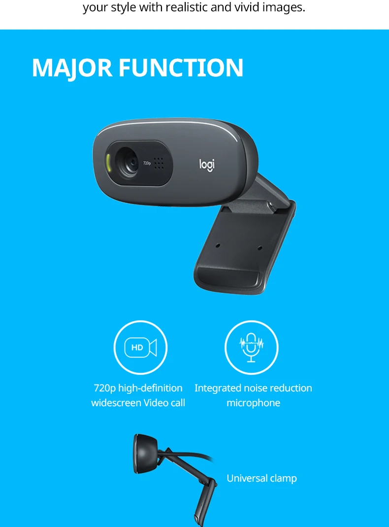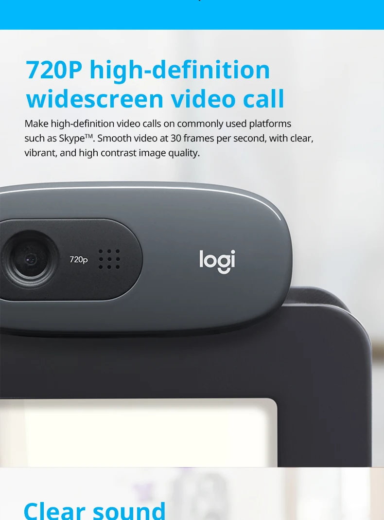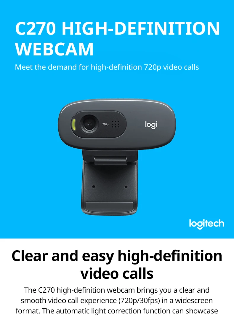 The C270 high-definition webcam brings you a clear andsmooth video call experience (720p/30fps) in a widescreenformat.The automatic light correction function can showcase