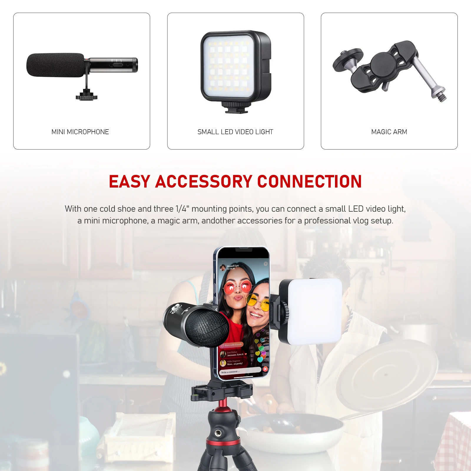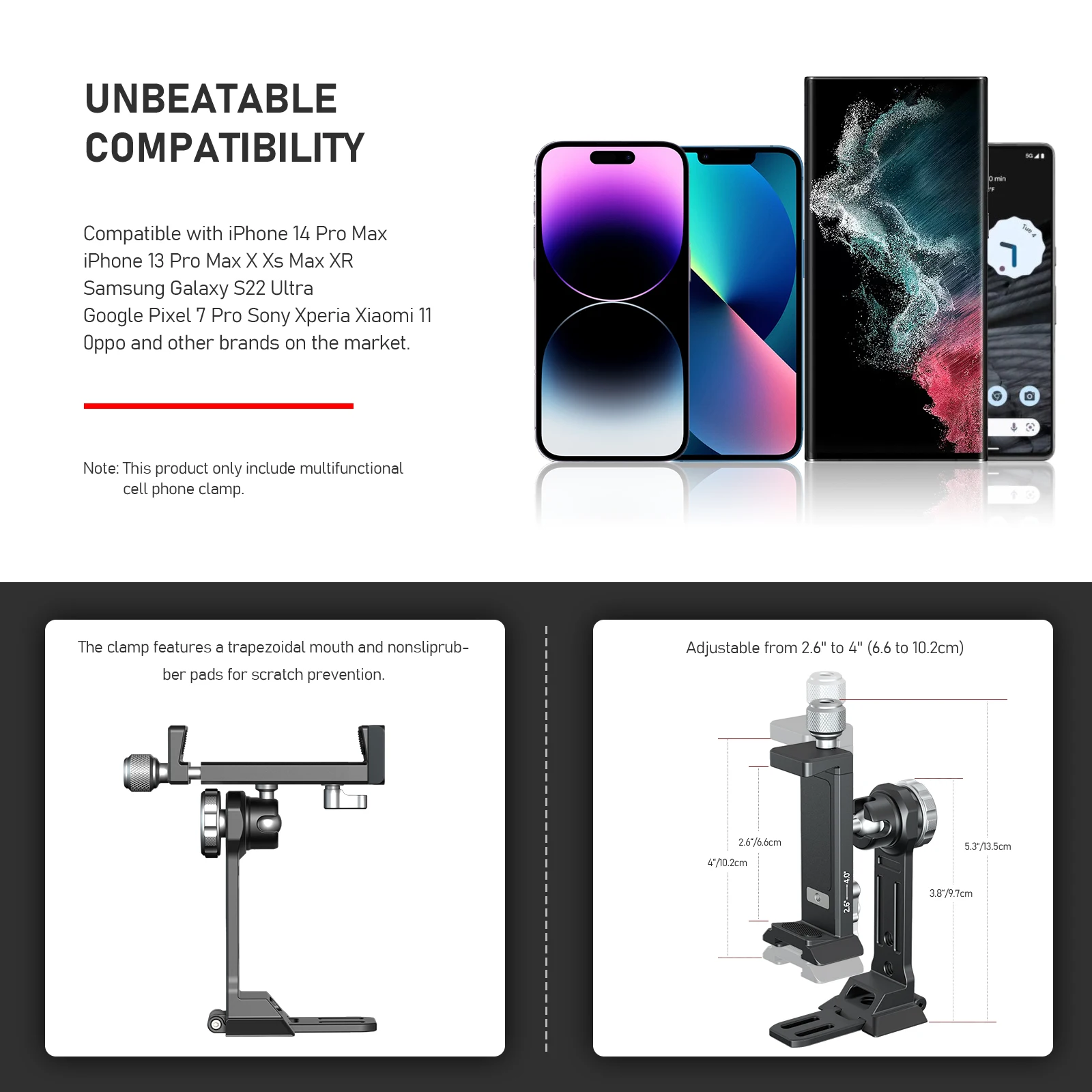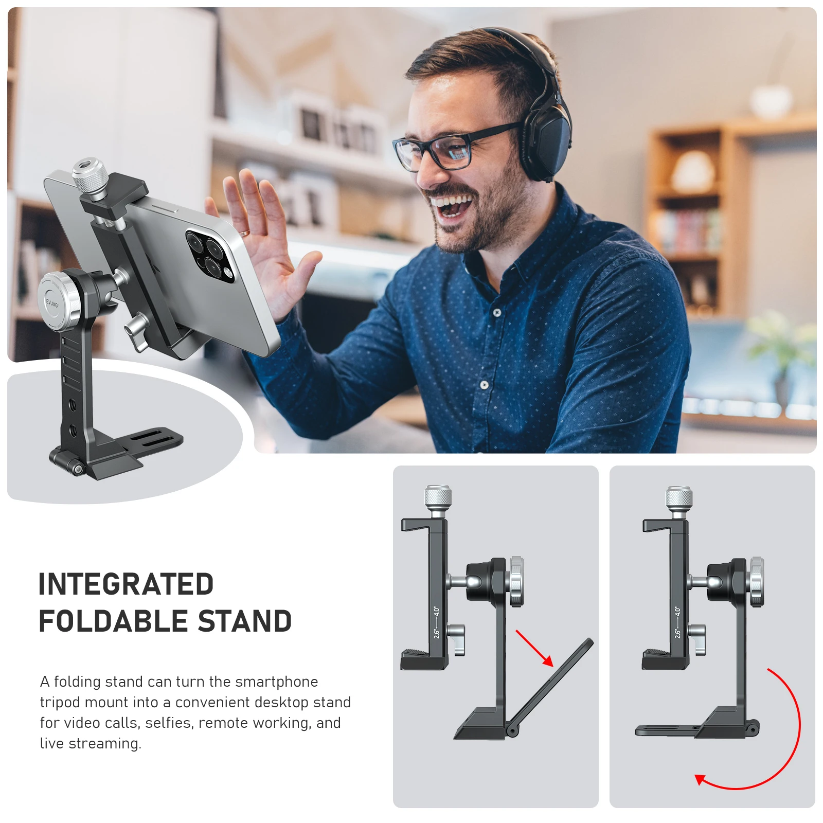 This phone clip has multiple mounting options, with ¼" threads on the base and back, and a 1/8" screw on the base to add a cold shoe for the light. Ideal for attaching it to tripods, monopods, lights and more.