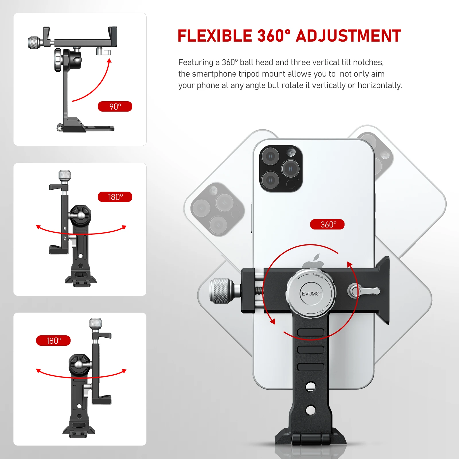 This smartphone tripod not only adjusts to the left, right and top 90 degree notches with the ball head. You can also turn your phone to any angle and rotate it vertically or horizontally.