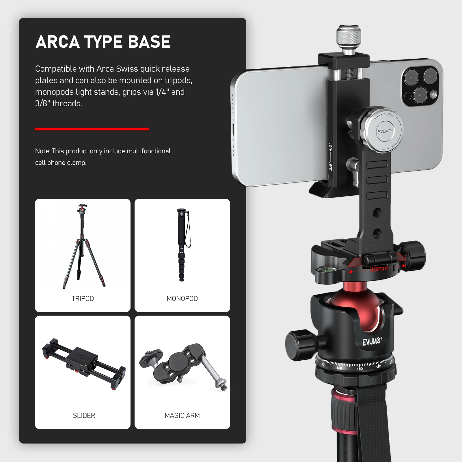 The base is shaped so that the smartphone tripod mount can be attached to a ball head with an arca swiss clamp. It can be connected to camera easily.
