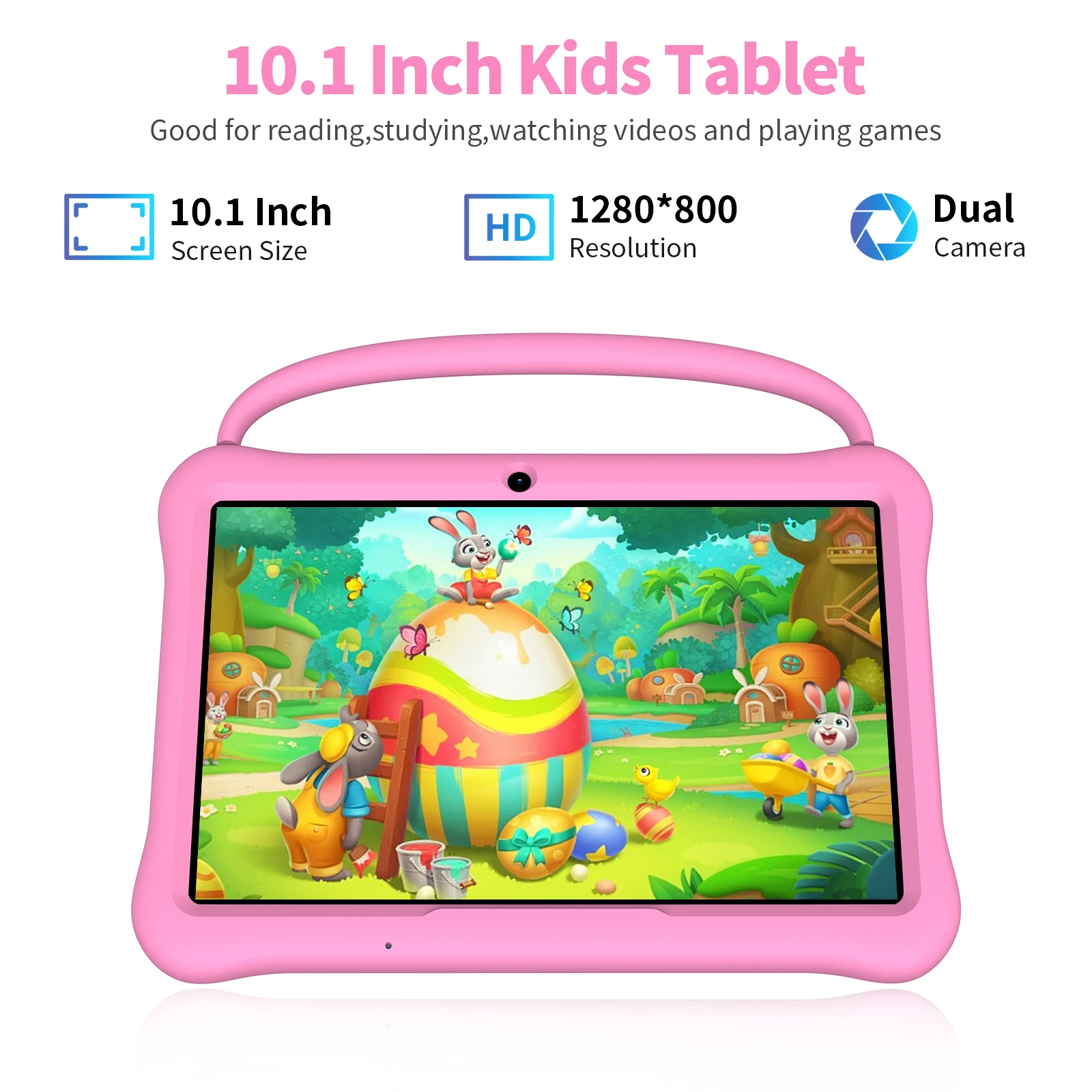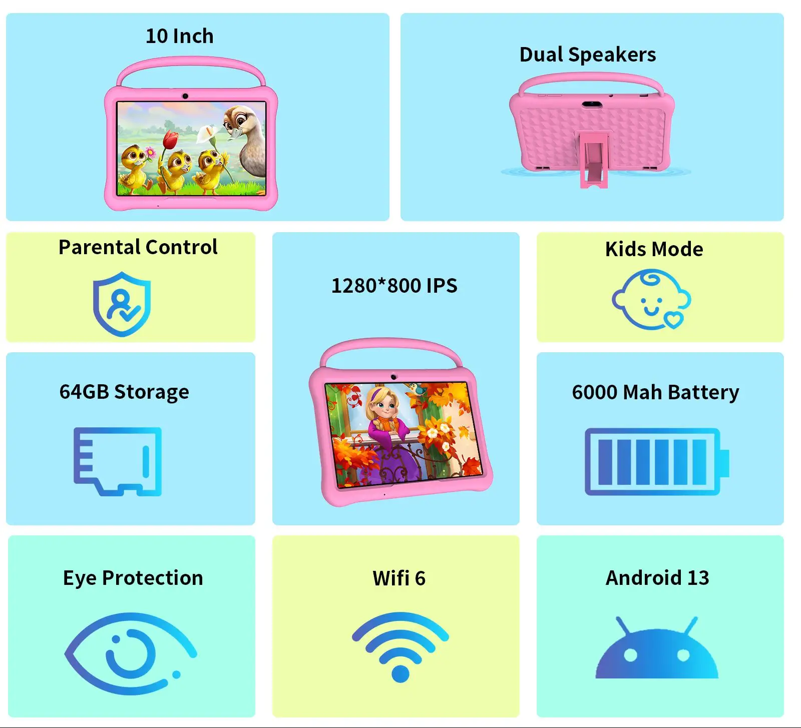 【NEW EDITION KIDS TABLET 10 INCH WITH CASE INCLUDED】Latest Version 10'' Kids Tablet for kids 3-12. PRITOM Kids Tablet is equipped with the latest operating system Android 13 which is safer and faster than the previous android versions and it can also eliminate unwanted ads. Besides, our kids tablet adopt 1.5GHz quad-core processor. 4GB(2+2GB virtual) RAM, 64GB ROM and includes a micro SD card slot, you can easily expand the storage space up to 1TB with a micro SD card (not included).Large storage space allows children to enjoy a high-speed online world!