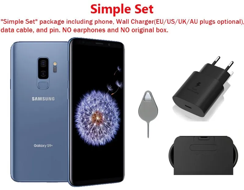"simple set" means “Samsung Galaxy S9+ G965U1 64GB ROM with Wall charger and data cable, no earphone, no original box”