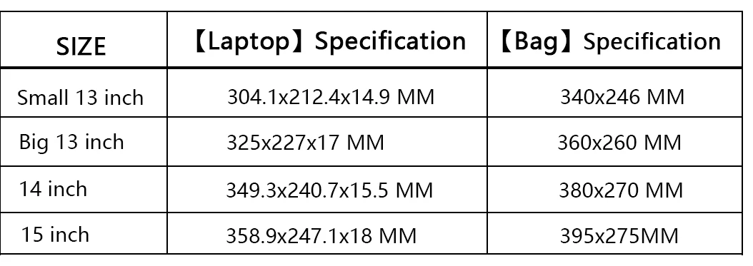 ② This Product is Suitable for the Bare Metal State of Laptop, Not Suitable For Laptop with Case.If you don't know how to Choose the Size, Please Refer to the【Laptop 】Specification, if the Specification of your Laptop is Close to the 【Laptop 】Specification, You Can Choose the Corresponding Size (【Bag】Specification) . Don't Care about your Laptop Size ;