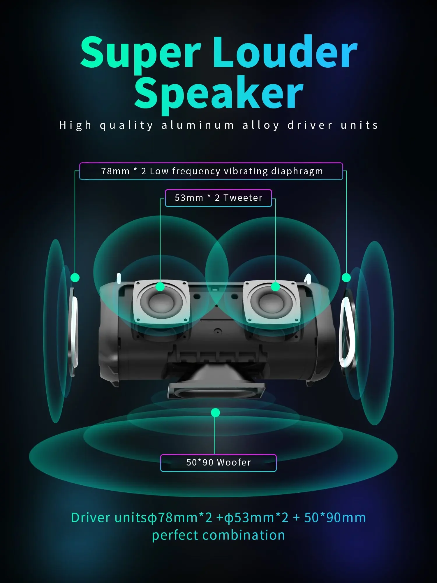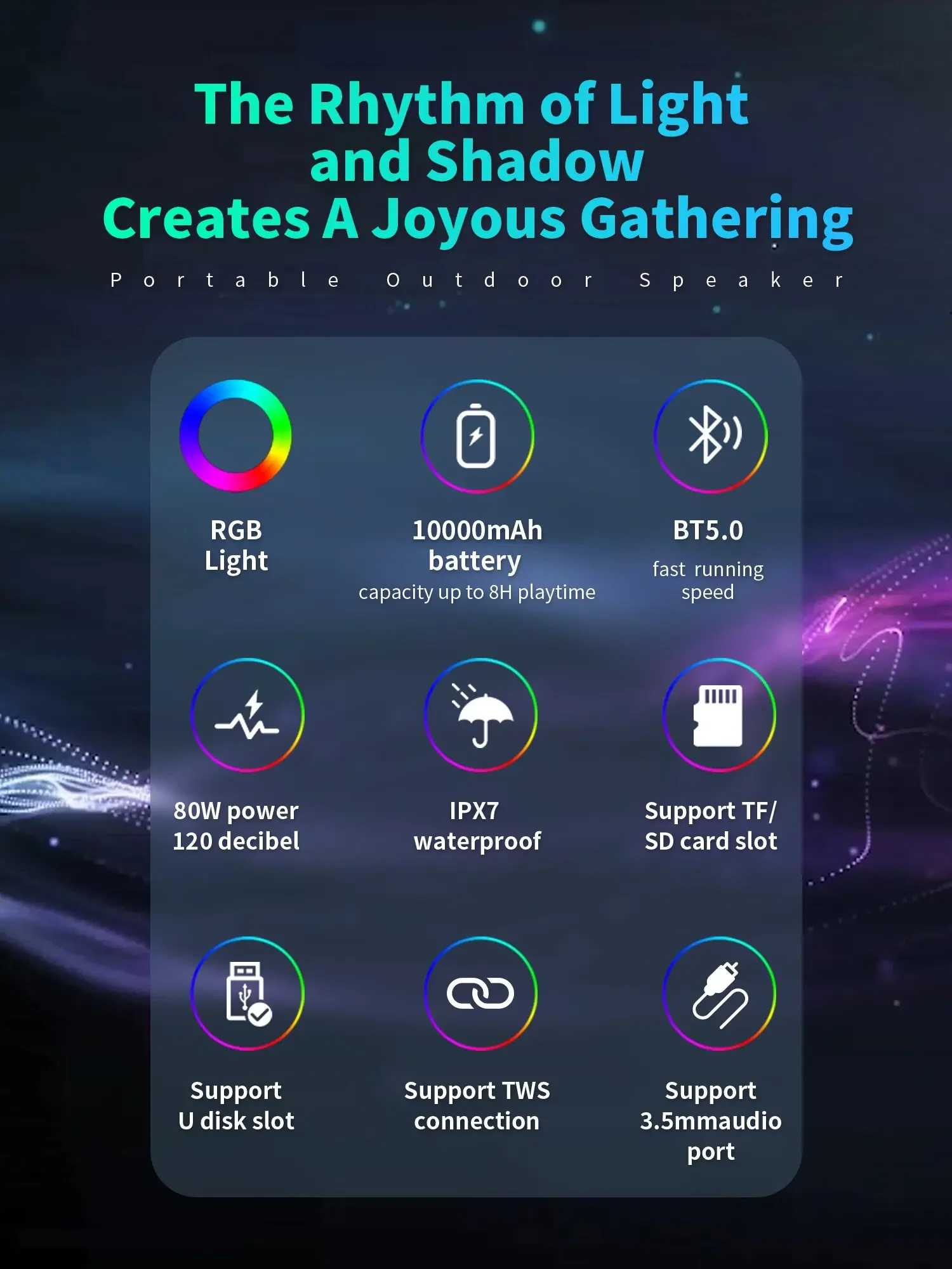 Portable Wireless Bluetooth Speakers 10000mAh Battery LongBattery LifeFrequency response range: 20Hz-20KHzOutput power: 80W~160WOperation method: buttonsChannel: 2.1Number of speakers: 3Playback format: MP3, WMA, WAV, FLC, APEWaterproof grade: IPX 7Built in battery capacity: over 4000 milliamperesBox material: ABSSignal to noise ratio: ≥ 85dBExtended storage: 64GBSupported formats: TF cardBluetooth version: 5.0Product volume: 15cm * 11cm * 11cmProduct volume: 150 * 110 * 110mmInterface type: USBDear friend: Please choose the model you need to order when making a purchase. If you have any questions, please feel free to consult customer service for 24-hour online service!![]()