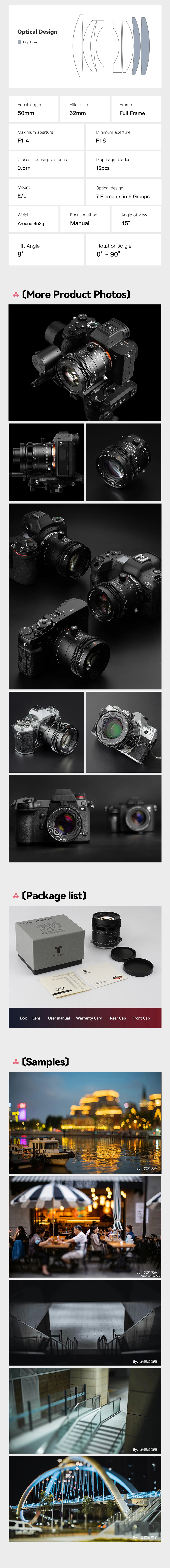 TTArtisan Tilt 50mm F1.4 MF Full Frame Camera Lens for Studio Photography Compat