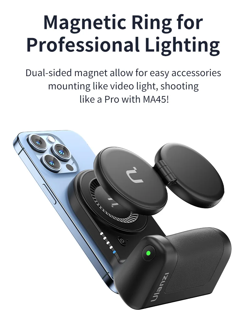 ULANZI MA45 Magnetic Phone Camera Grip Holder, Bluetooth Selfie Snap Camera Handle Built-in 5000mAh Battery Dual Sides Magnet Remote Shutter for iPhone 16 15 14 13 Magsafe Smartphone