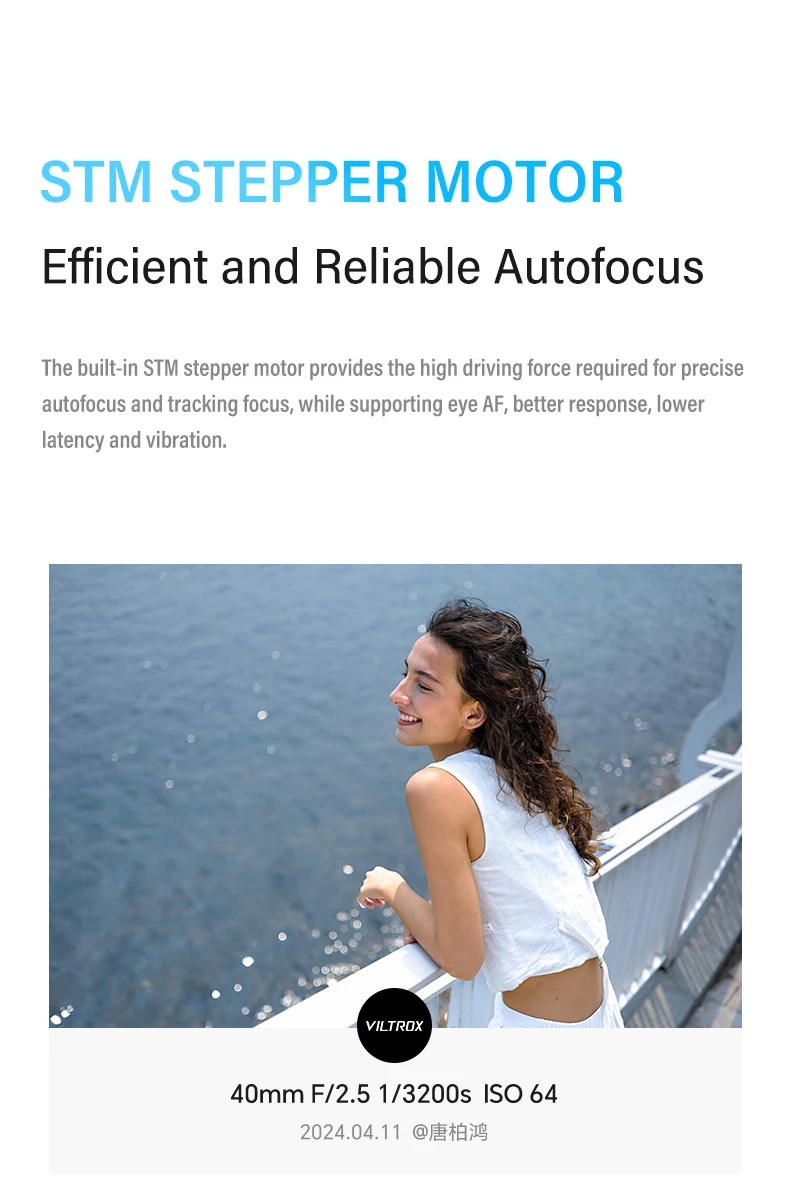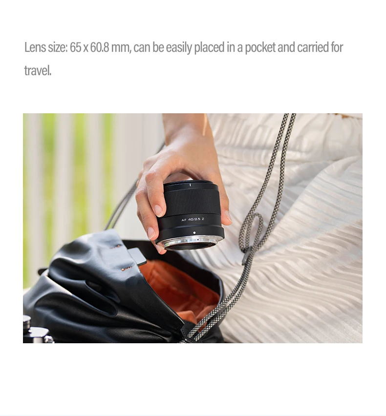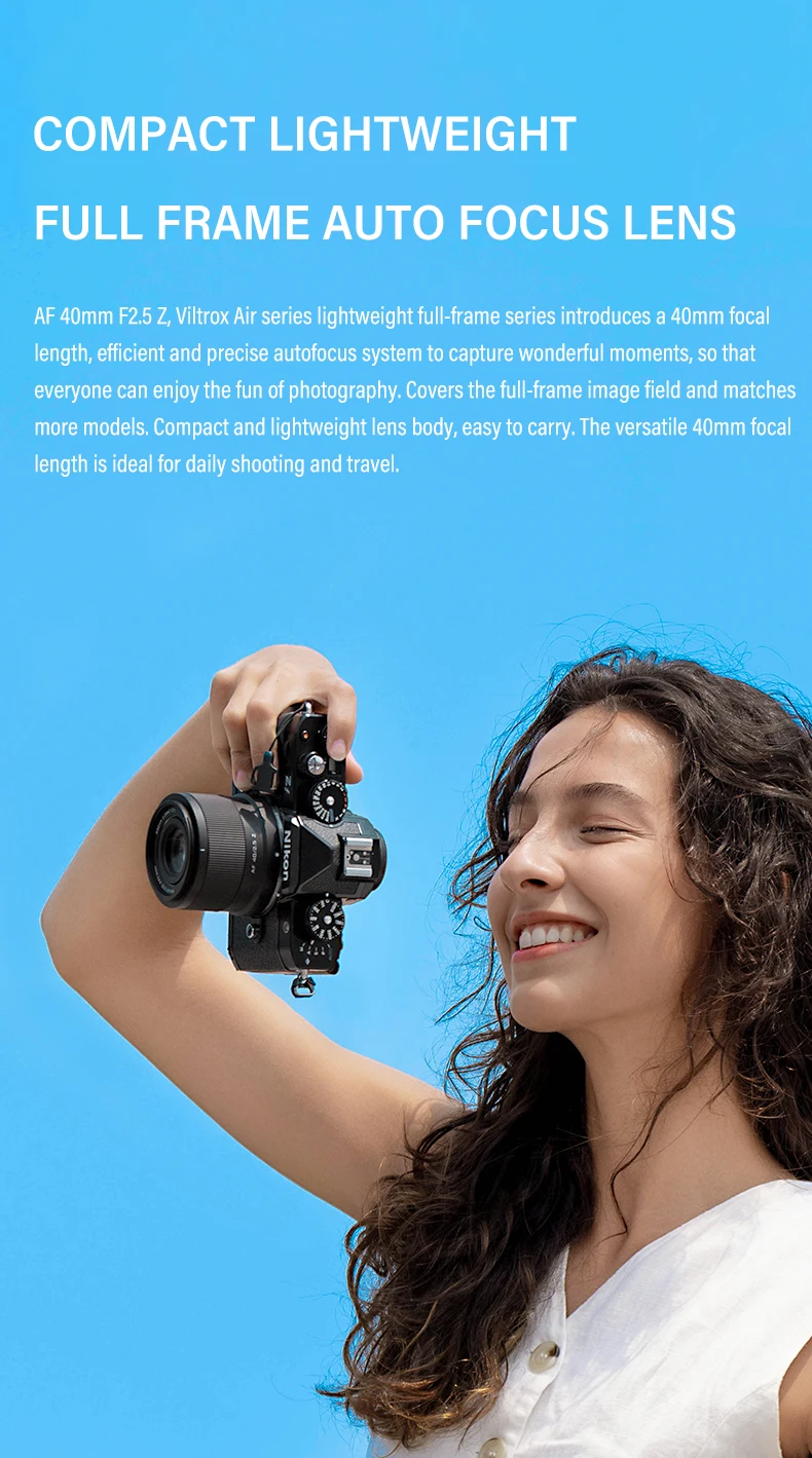 AF 40mm F2.5 Z, Viltrox Air series lightweight full-frame series introduces a 40mm focal length, efficient and precise autofocus system to capture wonderful moments, so that everyone can enjoy the fun of photography. Covers the full-frame image field and matches more models. Compact and lightweight lens body, easy to carry. The versatile 40mm focal length is ideal for daily shooting and travel.